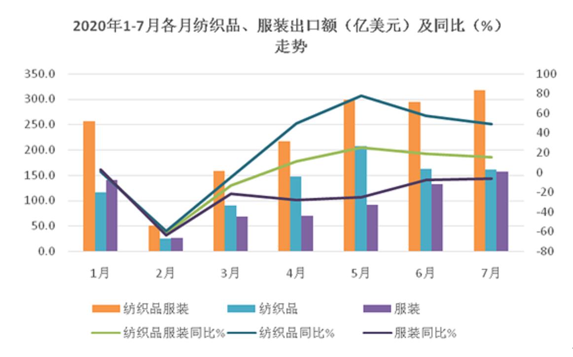 2020年1~7月纺织品服装进出口呈现如下特点: