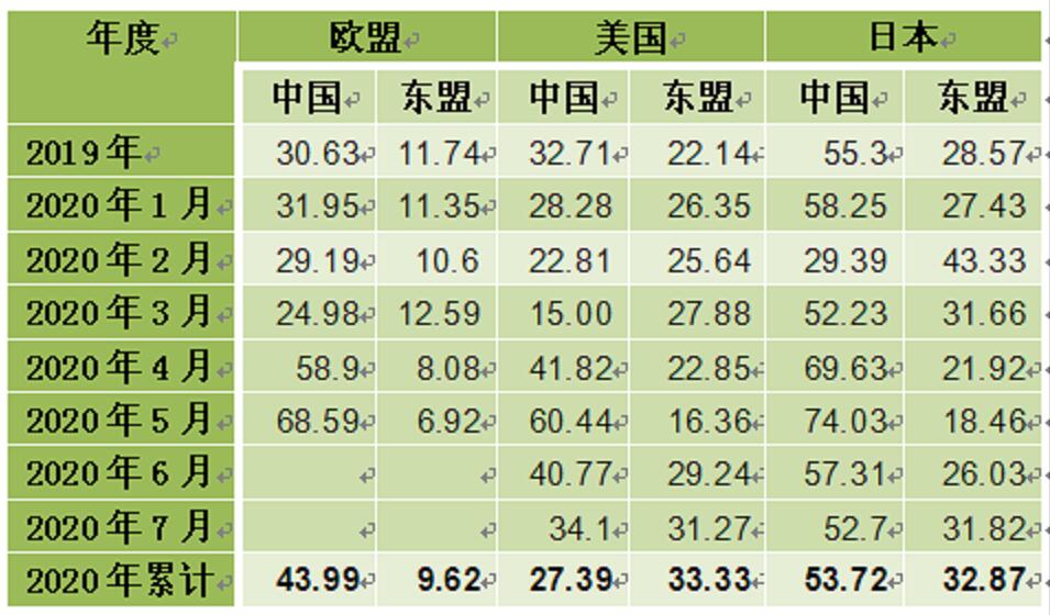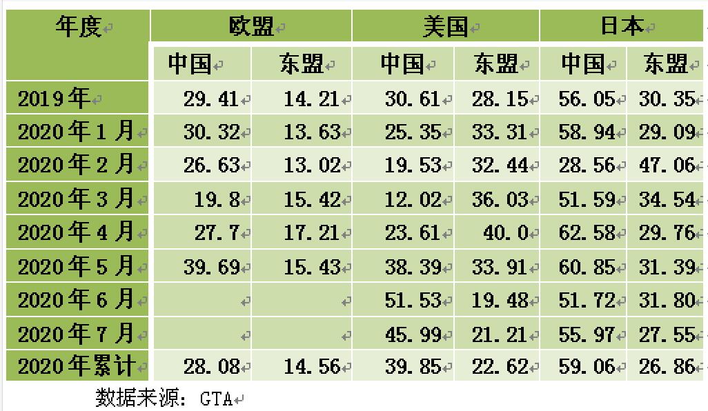 随着疫情的缓解,各市场对服装产品的采购逐步回归多元化轨道。从主要市场进口数据看,美国和日本自中国服装进口的比重在5月分别达到60.4%和74%的高峰,但之后逐步回落,至7月分别降至34.1%和52.7%,同期东盟所占份额再度扩张。