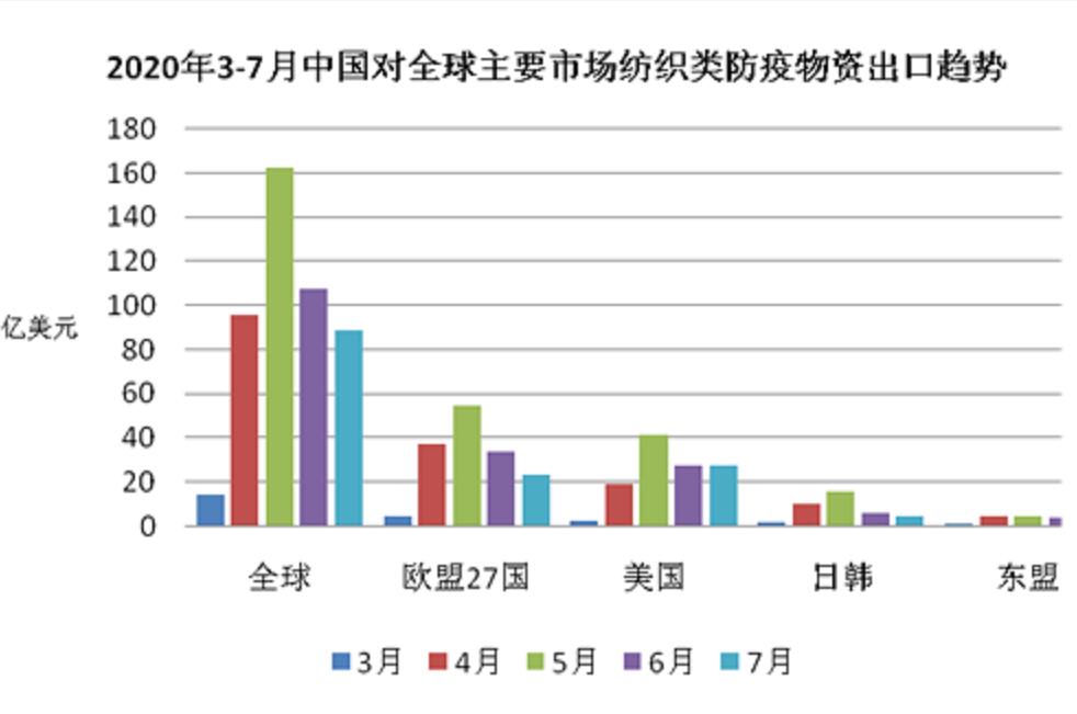 7月,防疫物资对除美国以外的地区出口均有明显回落,对欧盟、日韩和东盟出口环比分别下降30.5%、15%和50%,美国由于疫情仍未有效缓解对防疫对物资的需求不降反升,环比增长1%。
